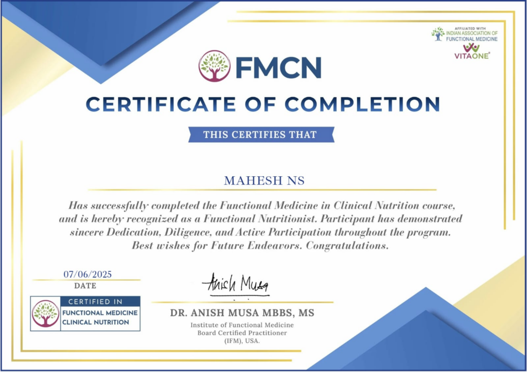 Mahesh NS combines personal experience, certifications in nutrition, and a holistic approach to prevent lifestyle diseases, offering tailored, evidence-based solutions for long-term wellness and sustainable health improvement.